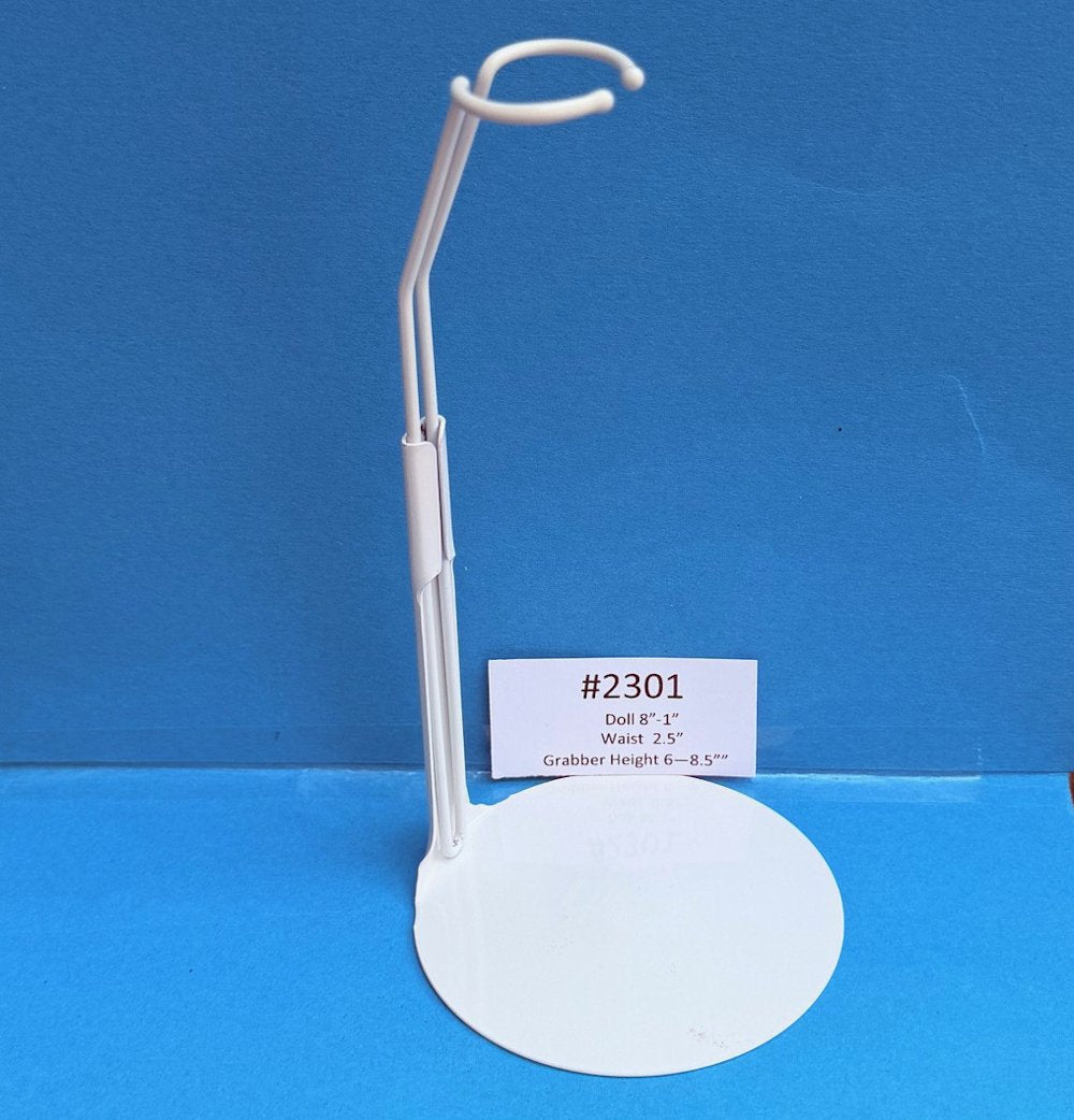 Designed specifically for Skipper and similar type narrow waist dolls, this stand has a 3" base and a fully coated doll grabber that extends in height from 6" - 8". This stand suits dolls from 8" - 11", and with a waist of approx 2 1/2"