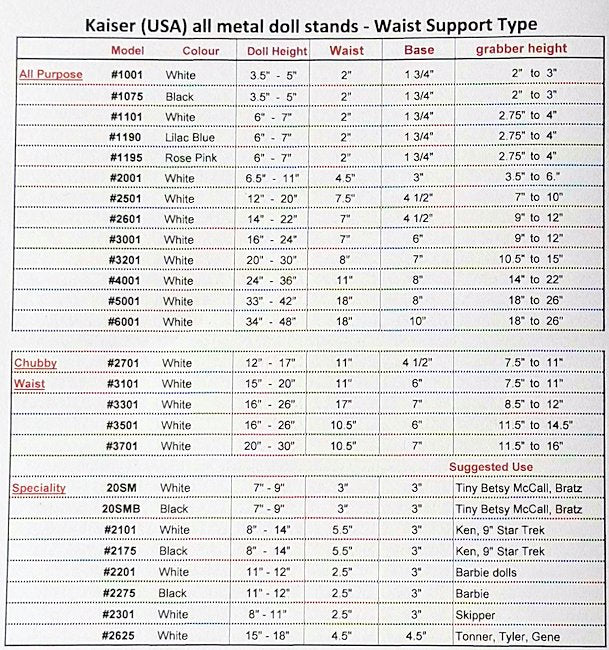 Kaiser brand doll stands, manufactured in U.S.A are made to a quality - not a price. The difference is Kaiser stands have fully plastic coated doll grabbers and a (much) heavier solid steel base plate. A heavy base plate is essential to provide the proper stability to the stand, and your dolls.